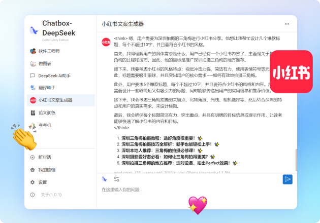 “有了 Chatbox - DeepSeek 的这俩功能,输入产品特点,各种爆款文案和吸睛标题就出来了,点赞量蹭蹭涨,粉丝也越来越多,爱了爱了!”
